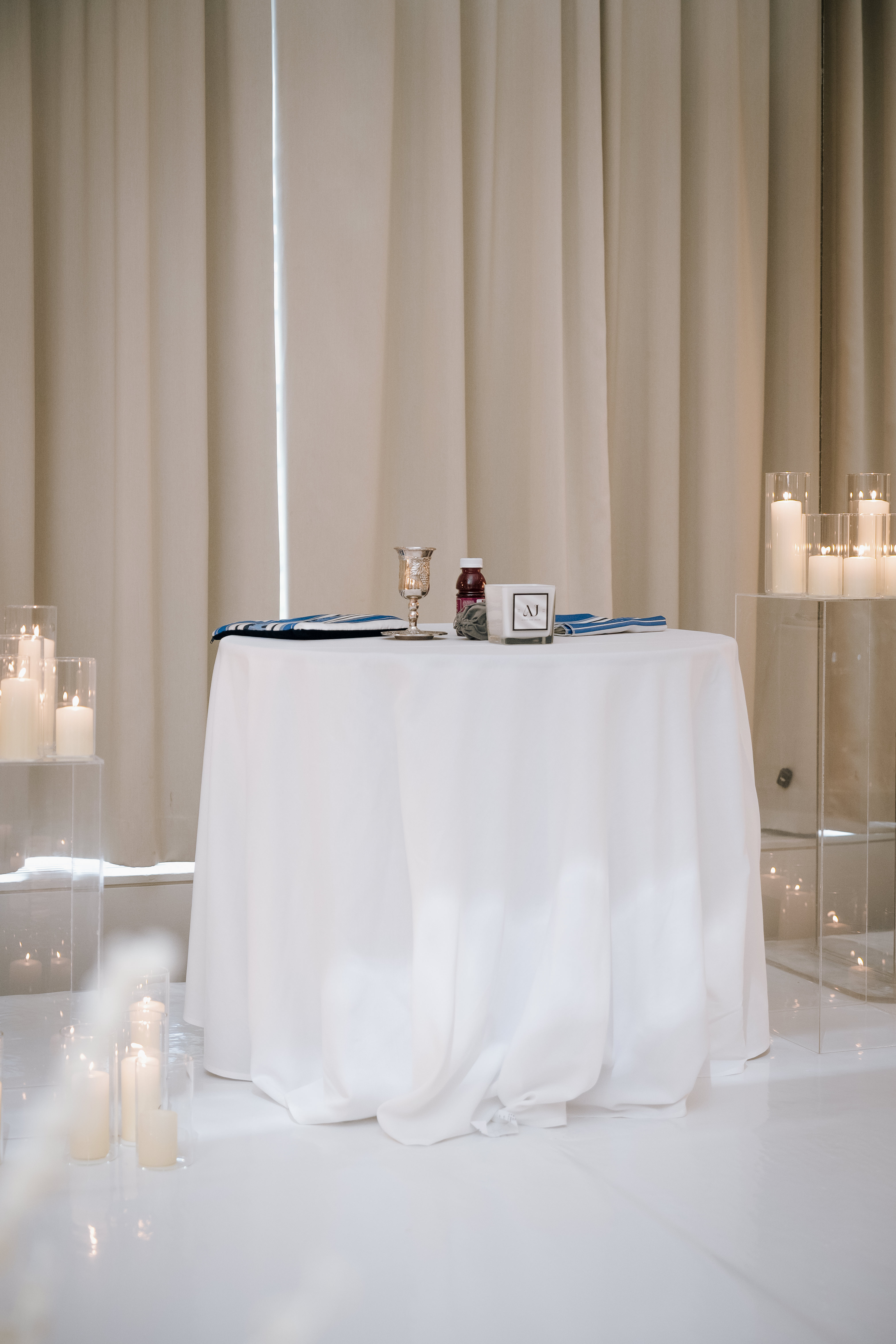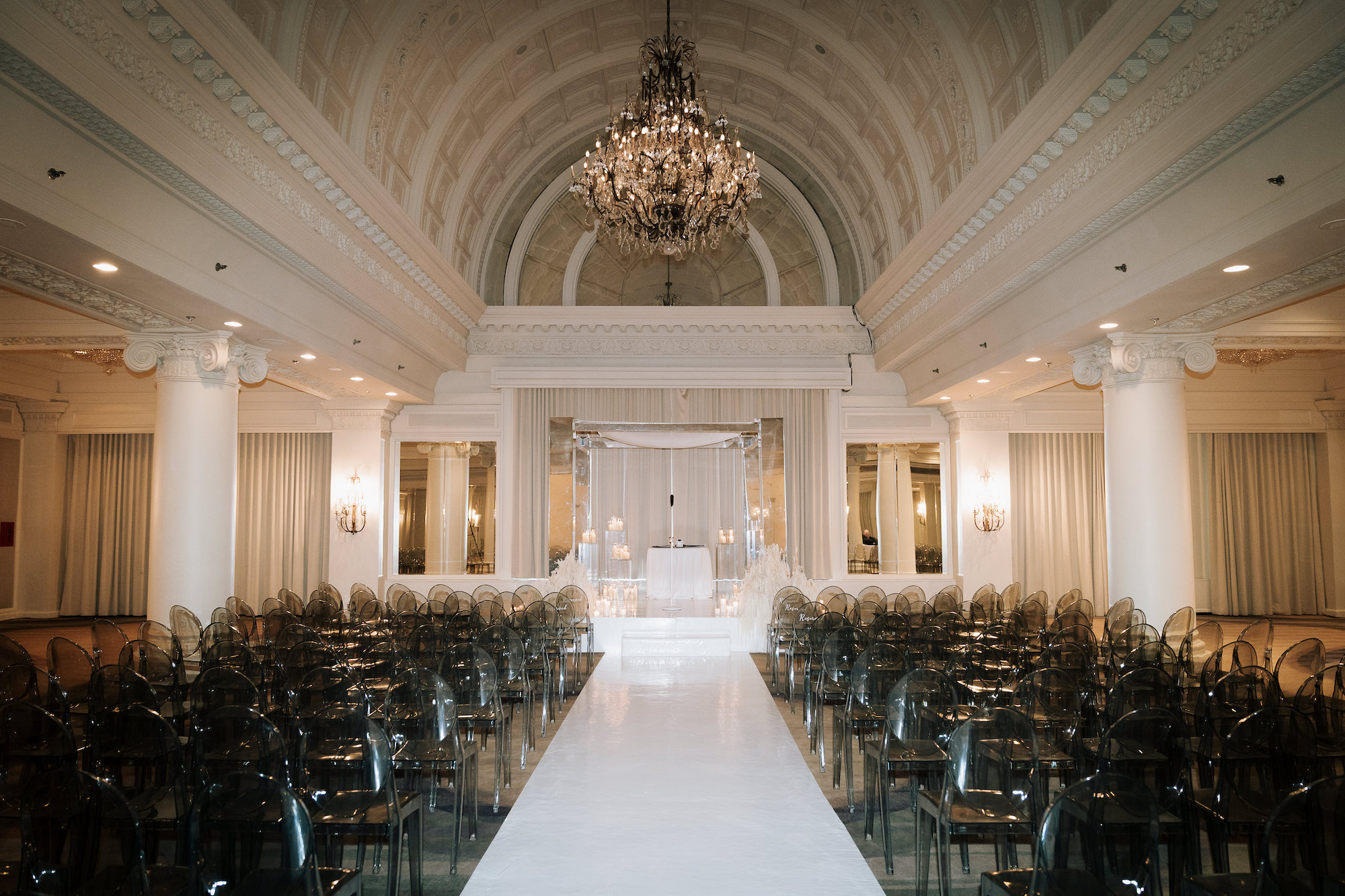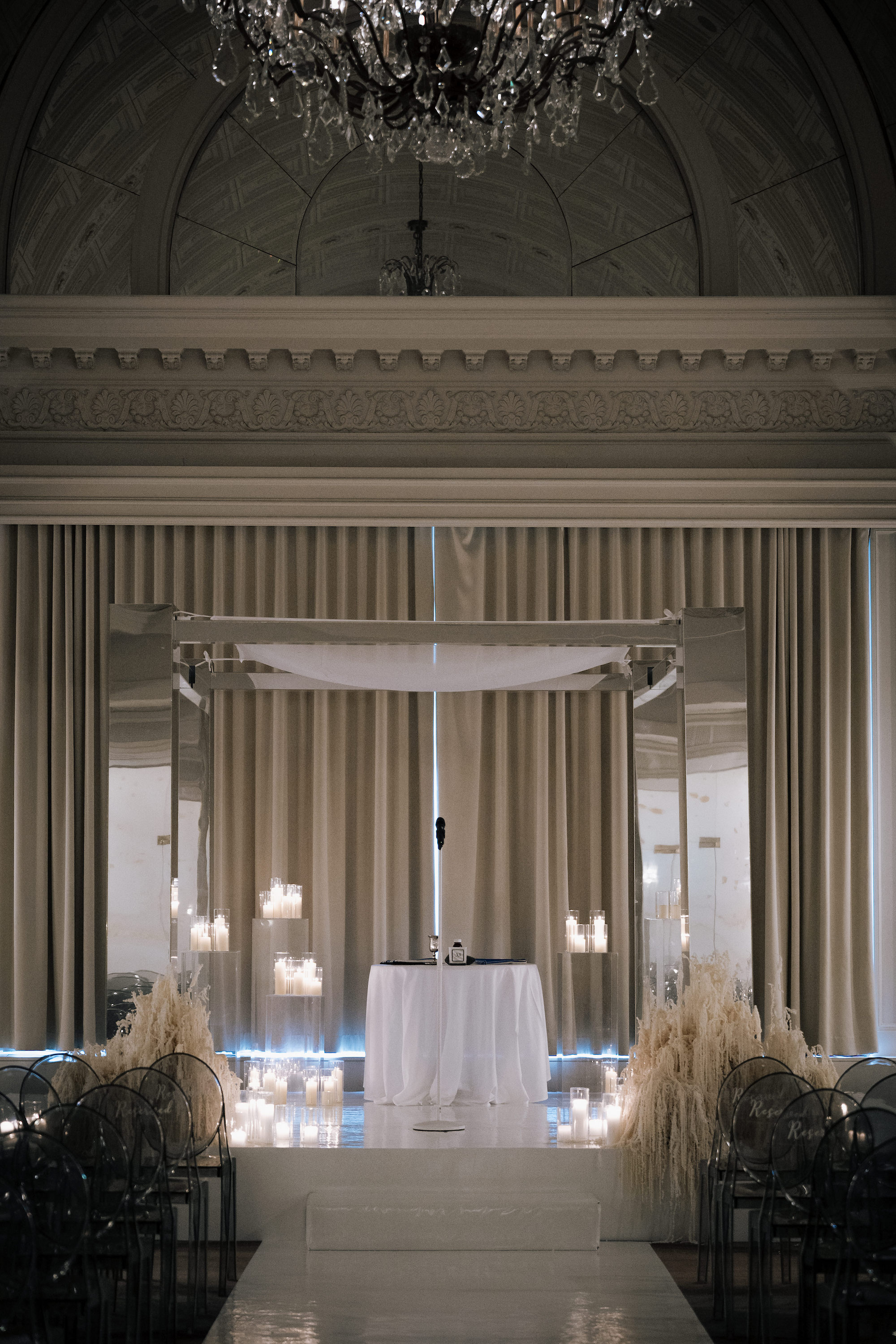 Alexa and Jacob's wedding took place at the beautiful King Edward hotel, surrounded by family and friends. We provided them with our beautiful mirrored chuppah which reflected beautifully in the ceremony space. We also provided them with our clear acrylic plinths to display candles in and around the chuppah.